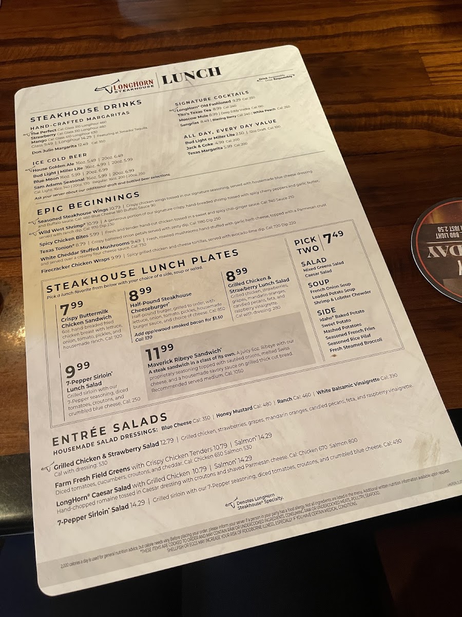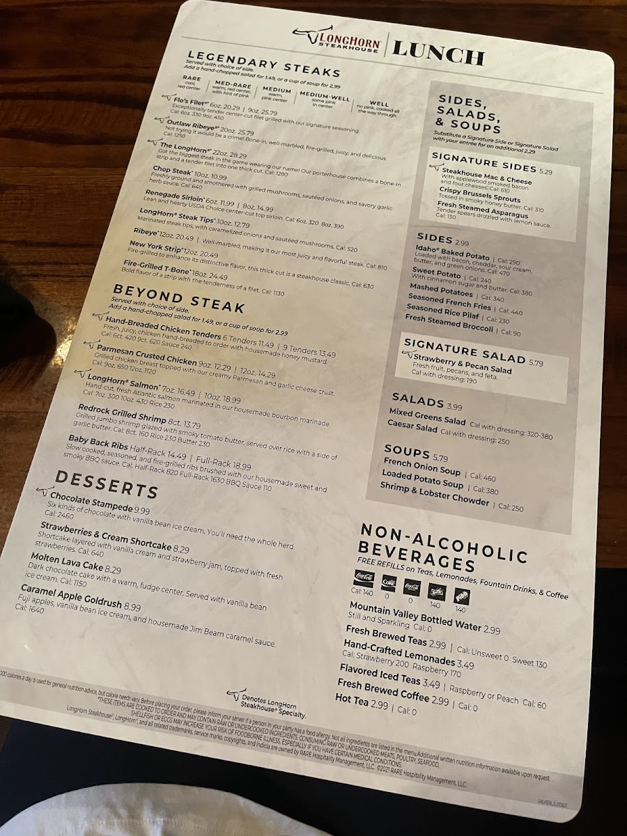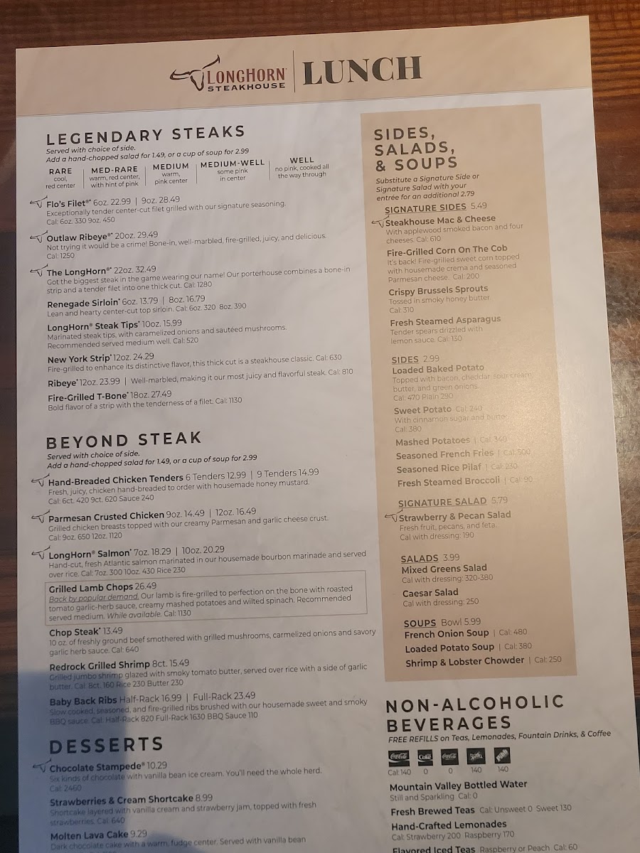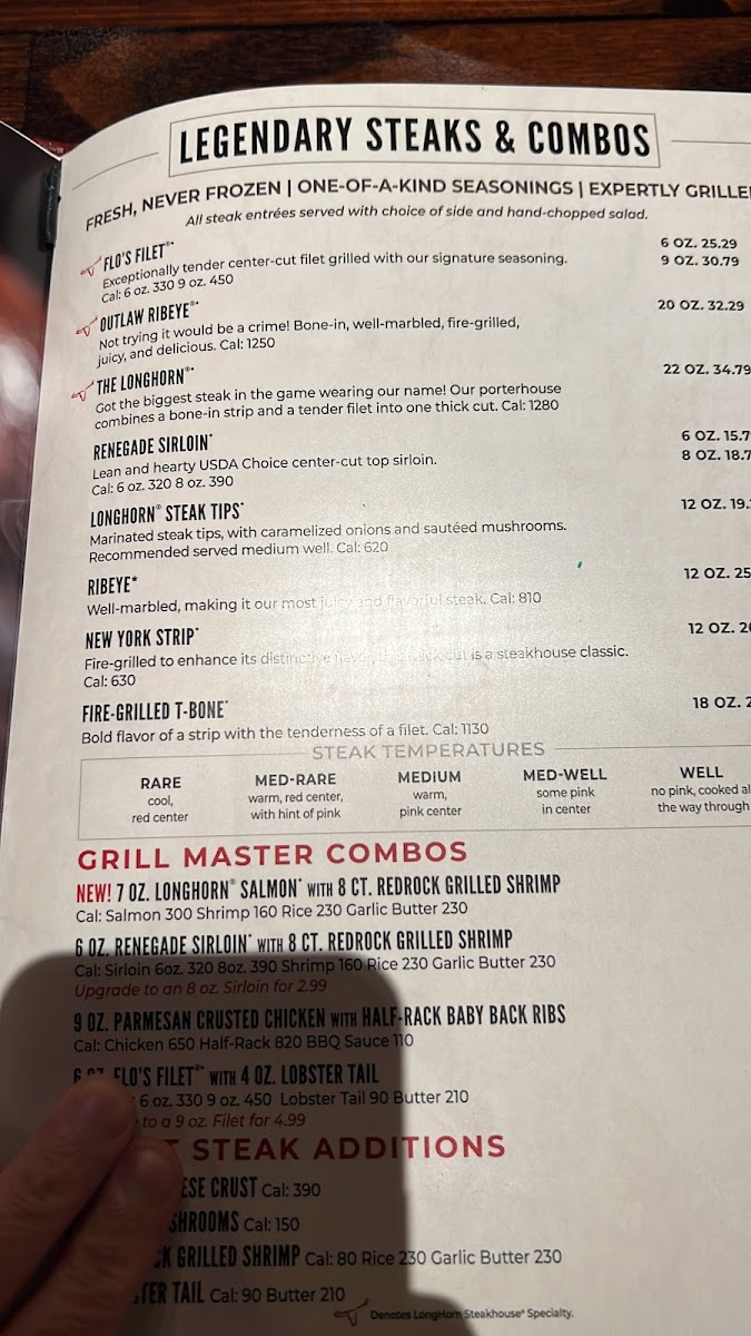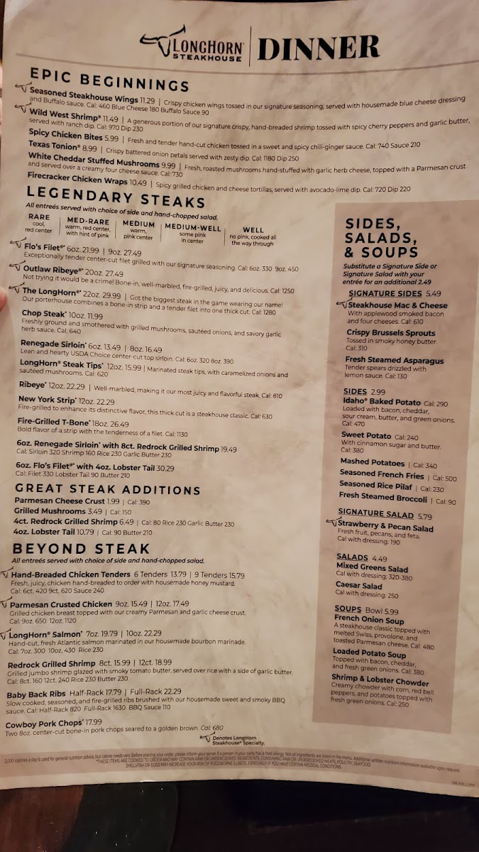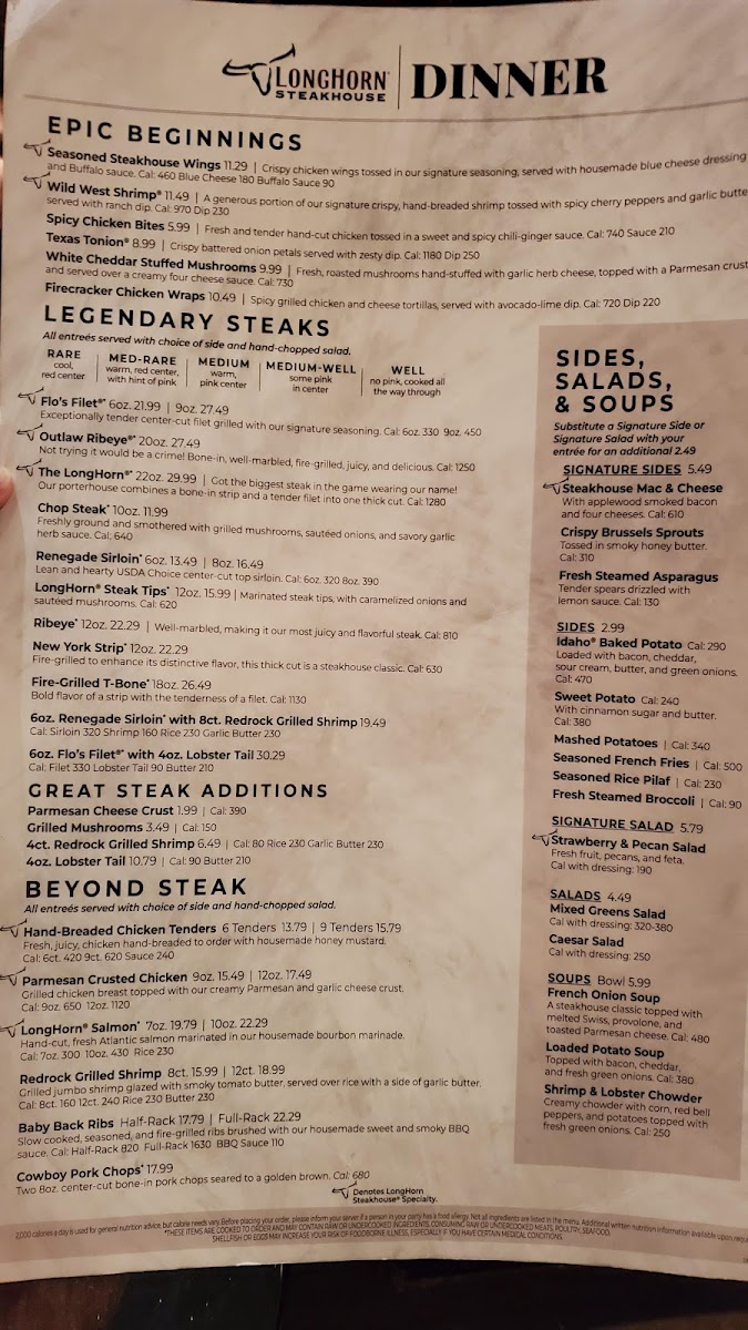 Signature steak options, such as the 9oz Flo fillet or ribeye, showcase skilled seasoning and grilling, delivering bold, satisfying flavors with options for tailored doneness. Accompanied by classic sides like asparagus and rich Caesar salad, the menu balances hearty protein with fresh, well-chosen accompaniments. Combined with attentive service and a welcoming ambiance, LongHorn Steakhouse crafts a dependable, flavorful dining experience that consistently draws praise for quality and comfort.