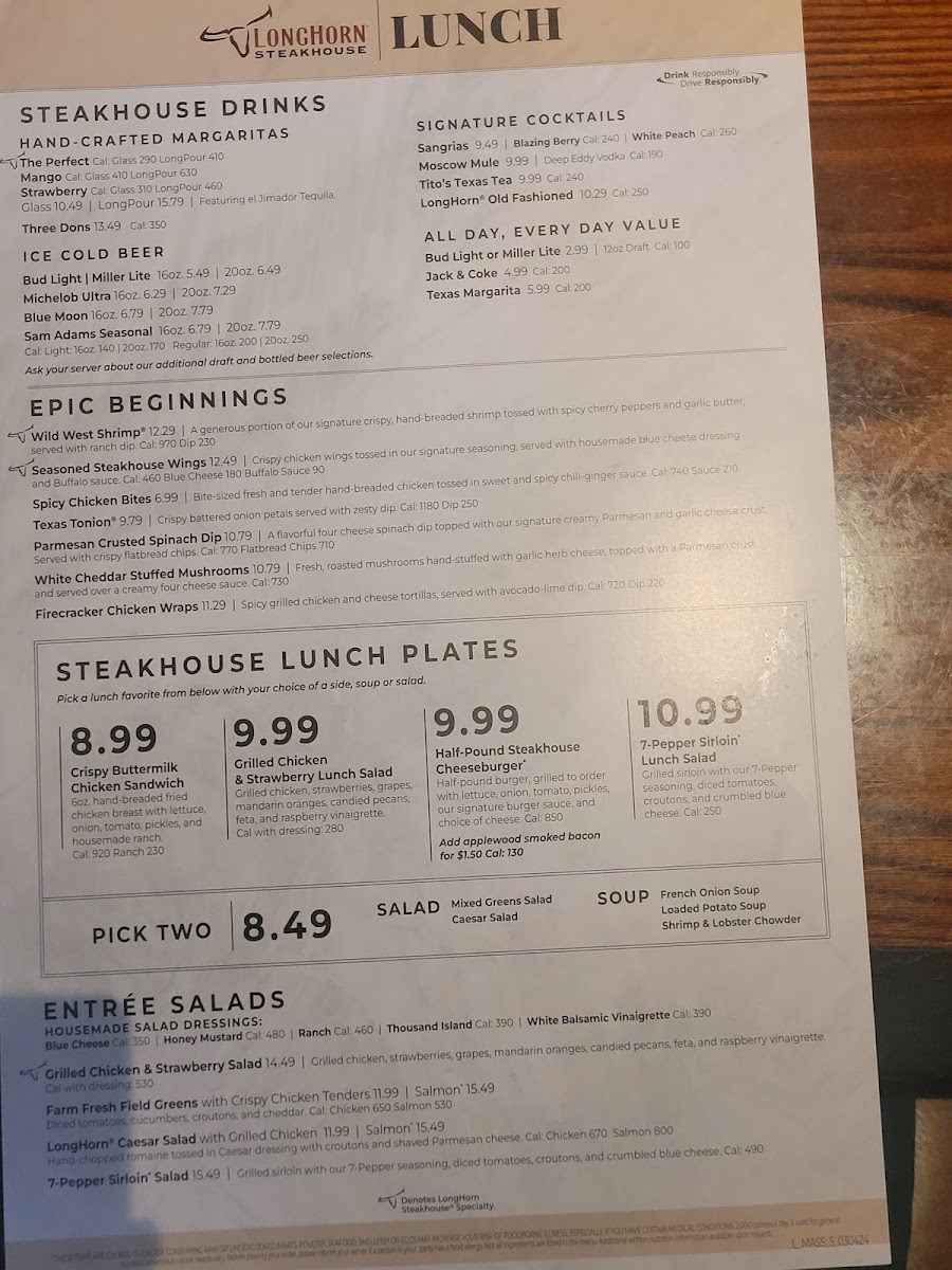 LongHorn Steakhouse offers a hearty, traditional American menu centered on expertly grilled steaks and flavorful bar & grill classics. Starters like the Parmesan Crusted Spinach Dip combine creamy four-cheese richness with a crisp garlic crust, perfect alongside flatbread chips. Their Seasoned Steakhouse Wings bring a crispy, well-spiced bite served with housemade blue cheese and Buffalo sauce, highlighting the robust barbecue heritage. The Wild West Shrimp stands out with handbreaded, crispy shrimp tossing bold Southern flavors into every bite.